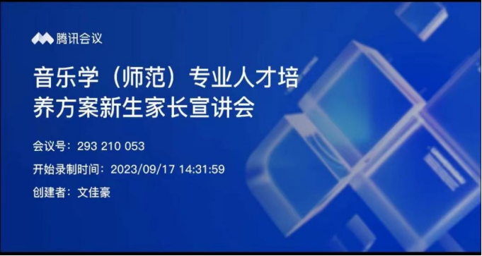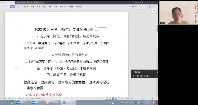 (通讯员 罗今吟)为更好宣传音乐学(师范)专业人才培养方案,9月17日下午,beat365手机版官网入口以线上会议的形式召开了音乐学(师范)专业人才培养方案新生家长宣传会。会议由音乐学(师范)专业负责人资利萍副经理主讲,2023级辅导员文佳豪主持,79位新生家长参加会议。