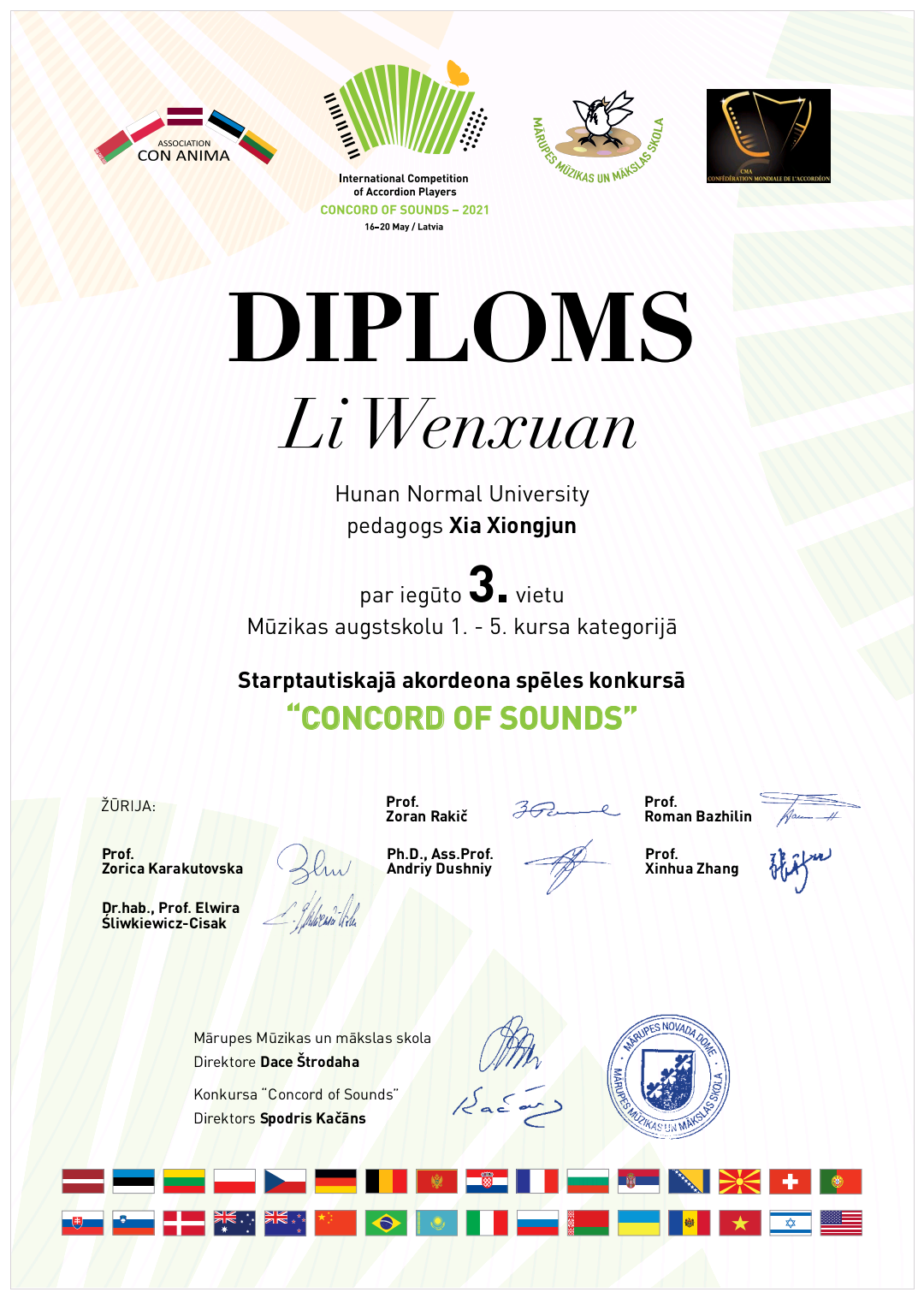 2021“声音的和谐”国际手风琴大赛是由马鲁佩音乐与艺术公司、拉脱维亚约瑟夫·维托尔beat365手机版官网入口手风琴班及Con Anima国际音乐公司协会联合举办。比赛以线上形式进行,选手来自来自拉脱维亚、中国、俄罗斯、美国、捷克、立陶宛等32个国家和地区,比赛根据参赛选手年龄及参赛人数共分为三大类共计14个组别,李文萱本次参加了高校组,比赛中共演奏三首难度较高的曲目,时长共计15分40秒,并最终获得本组第三名的好成绩。