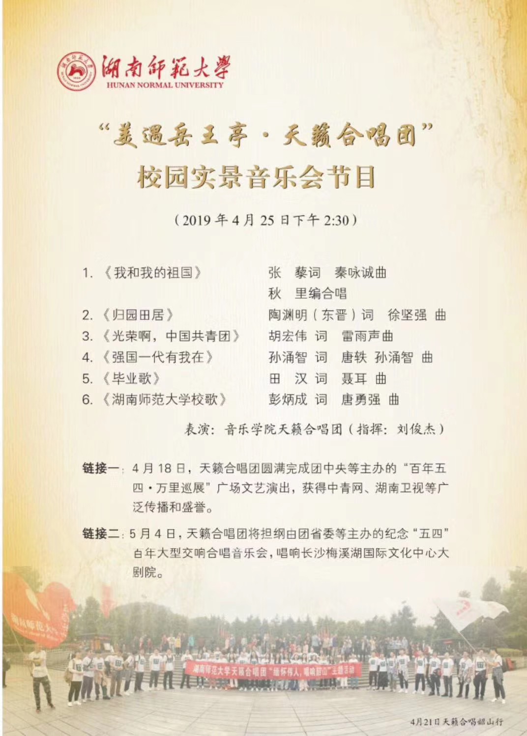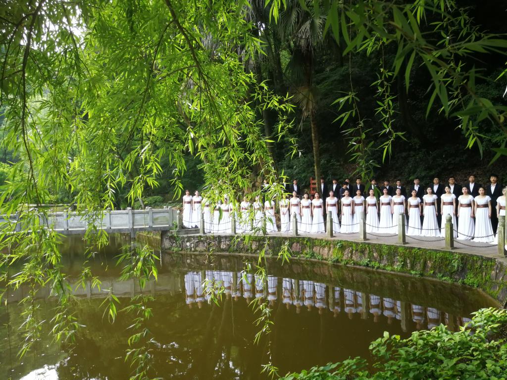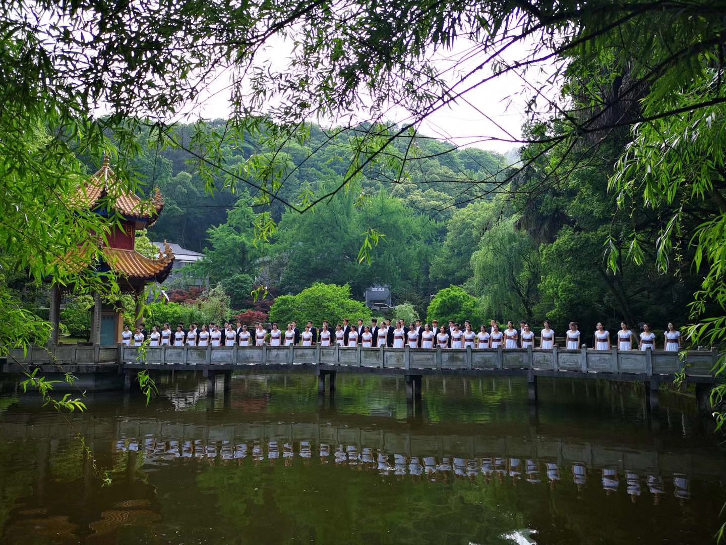 天籁合唱团,在山水掩映、鸟语花香的岳王亭,依地站开,在天籁合唱团常任指挥刘俊杰老师的指挥下,演唱了《我的我的祖国》、《强国一代有我在》和《归园田居》等歌曲,尤其是无伴奏混声合唱《归园田居》,词、曲、唱都与beat365手机版官网入口岳王亭的山水景色融合贴切,天籁合唱团的歌声在岳麓山的山水间回响,瞬间就把在场师生带入了“种豆南山下,草盛豆苗稀。晨兴理荒秽,带月荷锄归。。。。。。”的田园风光和陶渊明淡然的处世情怀中。天籁合唱团表演结束后,在场师生纷纷表示意犹未尽,余音在耳。
