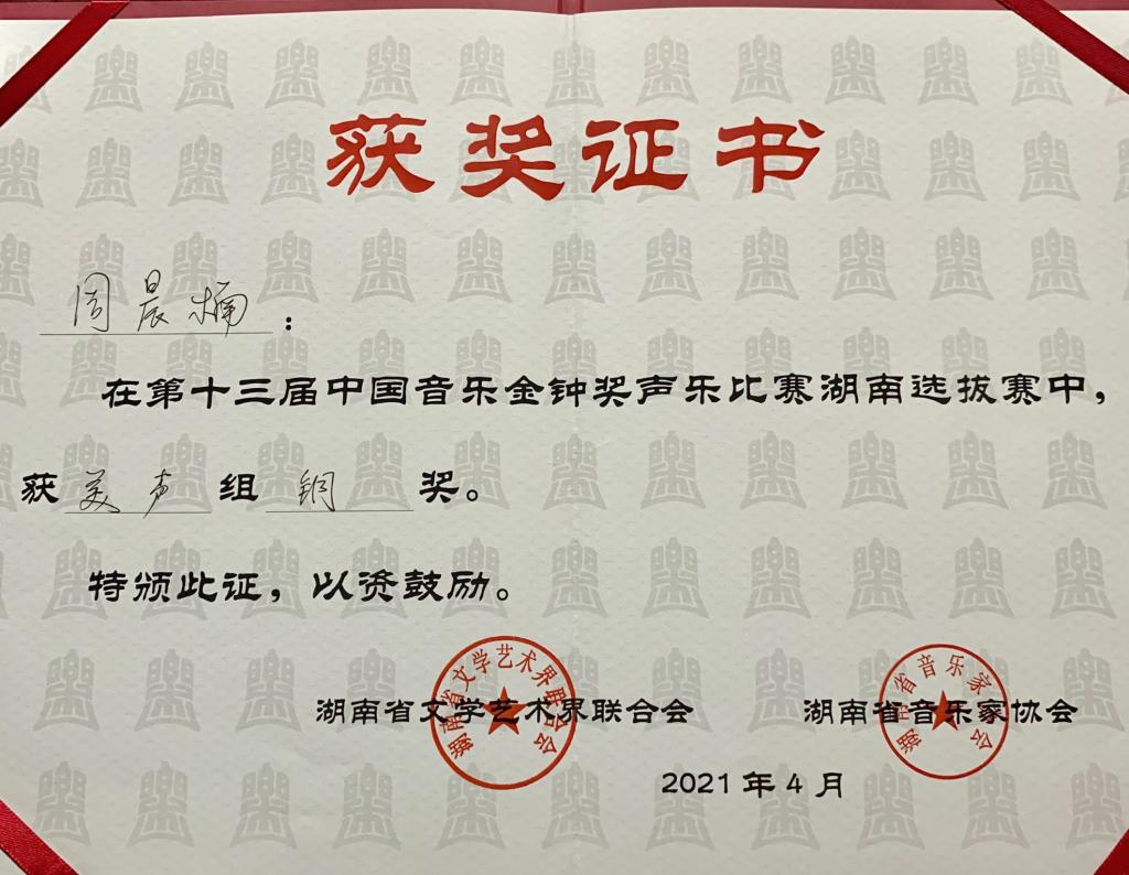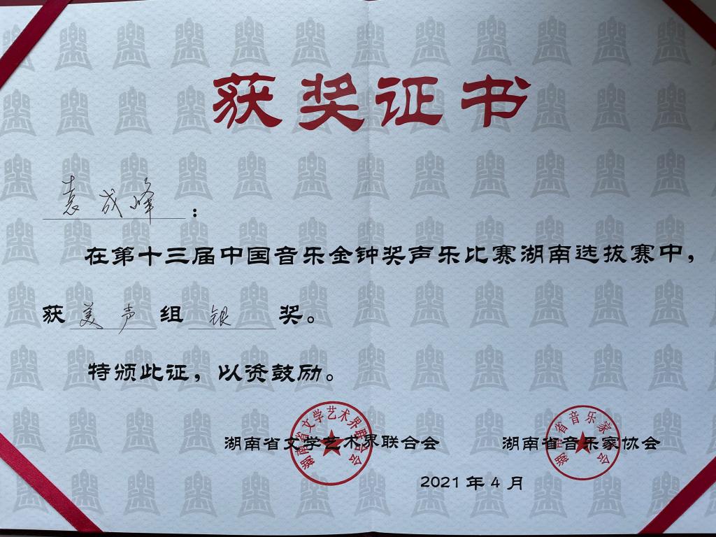 (供稿 吴楠子、任乔)第十三届中国音乐金钟奖声乐比赛湖南选拔赛,于2021年4月26日在邵阳公司顺利落下帷幕。beat365手机版官网入口青年教师虞晓曦、汪晓敏、刘文婷喜获美声组金奖,青年教师黄木子、研究生袁成峰荣获美声组银奖,研究生李思思荣获民族组银奖,研究生温靖、周晨楠获得美声组铜奖,获奖的研究生分别师从公司石倚洁教授、王宏伟教授、陈世扬副教授、吴静教授。
