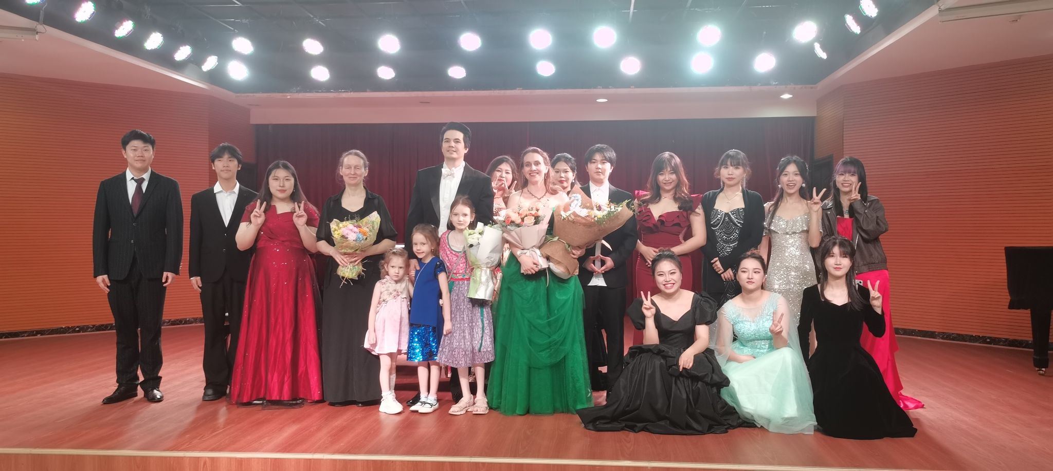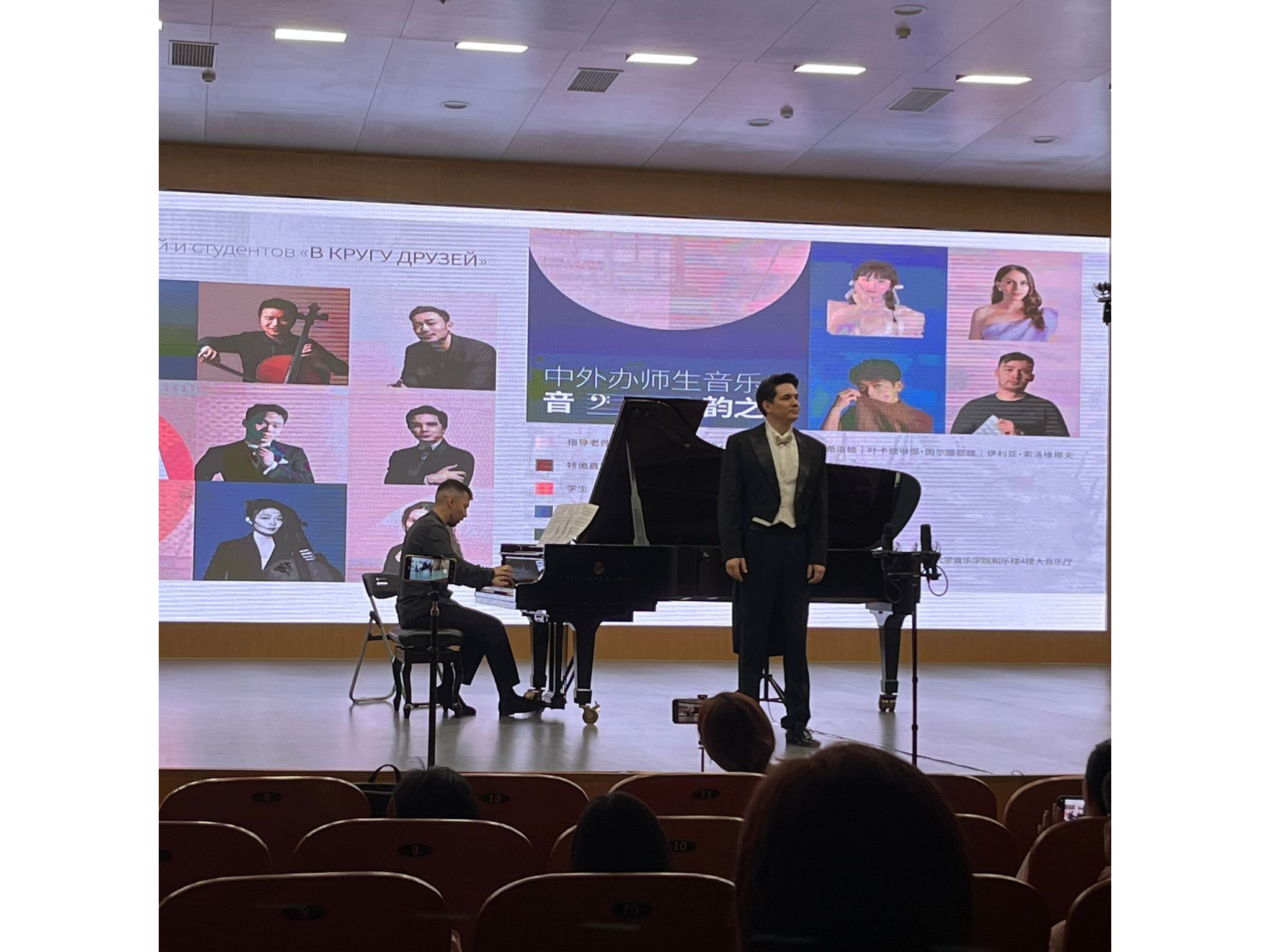 5月20日,中外班师生音乐会——音韵之旅在德乐楼大音乐厅举行。演出节目丰富多样,皮亚佐拉《冬季》由钢琴、大提琴、小提琴三种乐器三重奏演绎,维克多・萨吉罗夫演唱的《如苹果般红润》和《罗德里戈咏叹调》,以及叶卡捷琳娜・图尔纳耶娃演唱的《说吧,在枝叶的阴影中》和《此处美好》等,都展现了极高的演唱水准。中国作品《忆秦娥·恒山月》则通过声乐与钢琴的配合,传递了古典诗词的意境。压轴曲目《亚美尼亚狂想曲》以双钢琴的澎湃张力,为当晚音乐会画上辉煌句点。