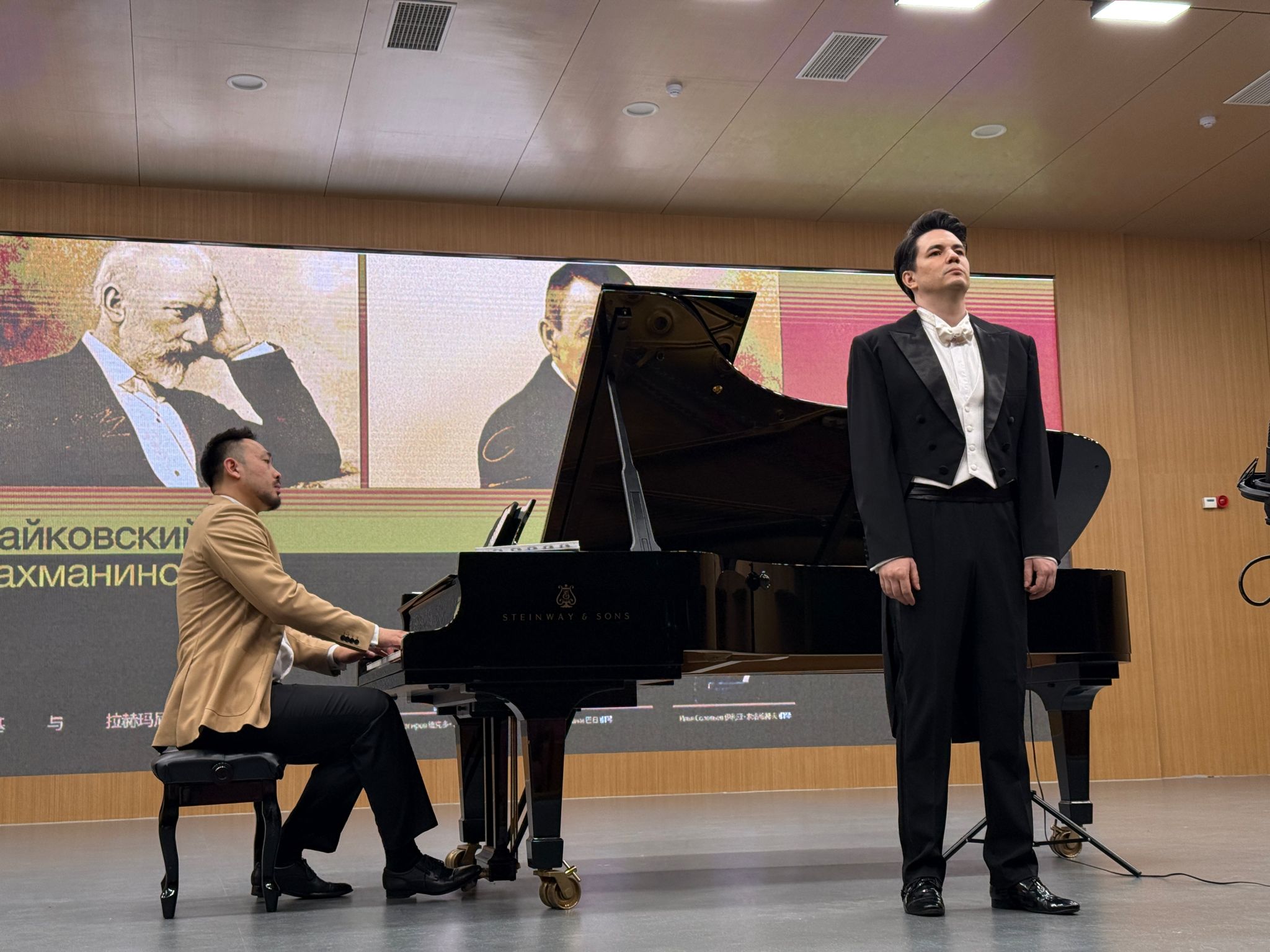 5月15日的德乐楼大音乐厅内,钢琴教师巴日与两位外教联袂呈现“献给柴可夫斯基与拉赫玛尼诺夫”专题音乐会。维克多·萨基洛夫以《在喧闹的舞会上》《如往日般孤独》等曲目,诠释了俄式声乐的深沉与忧郁;巴日与伊利亚·索洛维耶夫则通过《沉思》《夜曲》等独奏作品,展现了柴可夫斯基和拉赫玛尼诺夫钢琴音乐的戏剧性与诗意。