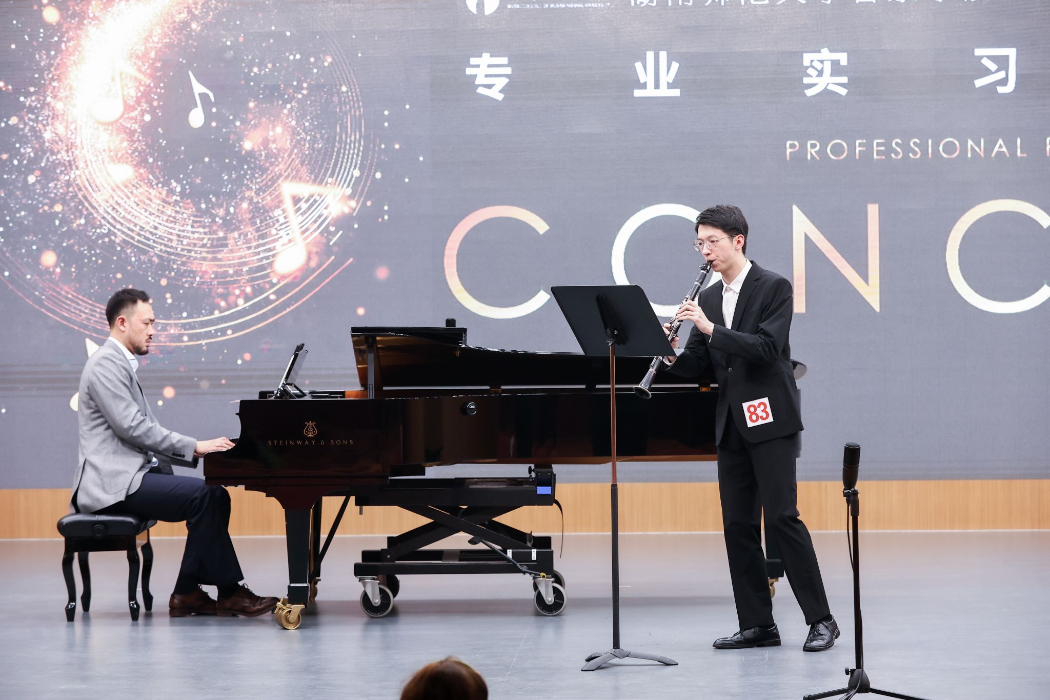器乐专场中,中外班学子们带来了涵盖弦乐、管乐等多种乐器的精彩演绎。舞台上,学子们手持乐器从容落坐,指尖与琴弓的配合、气息与管身的交融,将一首首经典作品的情感与意境精准传递。无论是古典乐曲的深沉典雅,还是现代作品的灵动鲜活,学子们都以娴熟的演奏技巧与细腻的音乐处理,让乐器的独特魅力充分释放。大提琴的醇厚、单簧管的清亮、小提琴的悠扬…… 不同乐器的音色在音乐厅内交织,不仅展现出学子们对乐器演奏的深刻理解,更体现出他们对音乐风格的精准把控,其中王诗彧与罗翃瀚的表现尤为亮眼。王诗彧带来的《e 小调大提琴奏鸣曲第一乐章》(勃拉姆斯曲),以细腻的情感表达和精湛的演奏技巧,将勃拉姆斯作品中深沉的浪漫与内在张力完美呈现,既展现出对乐器的精准掌控,也传递出对音乐内涵的深刻理解;罗翃瀚演奏的《引子主题与变奏》(韦伯曲),技术娴熟、音乐处理细腻入微,对作品的结构与风格把握精准,展现出对器乐演奏的深刻理解和出色的舞台驾驭能力。