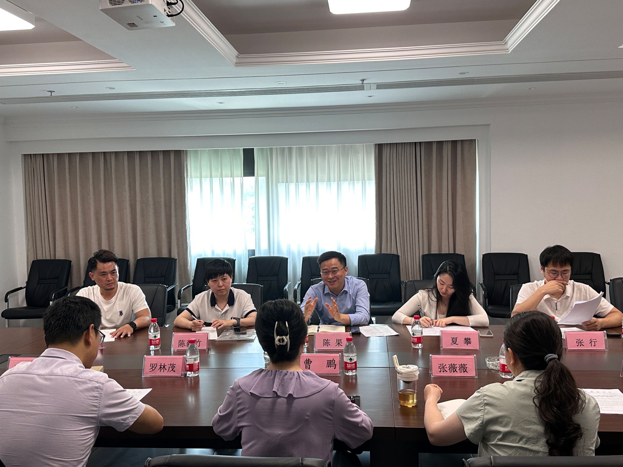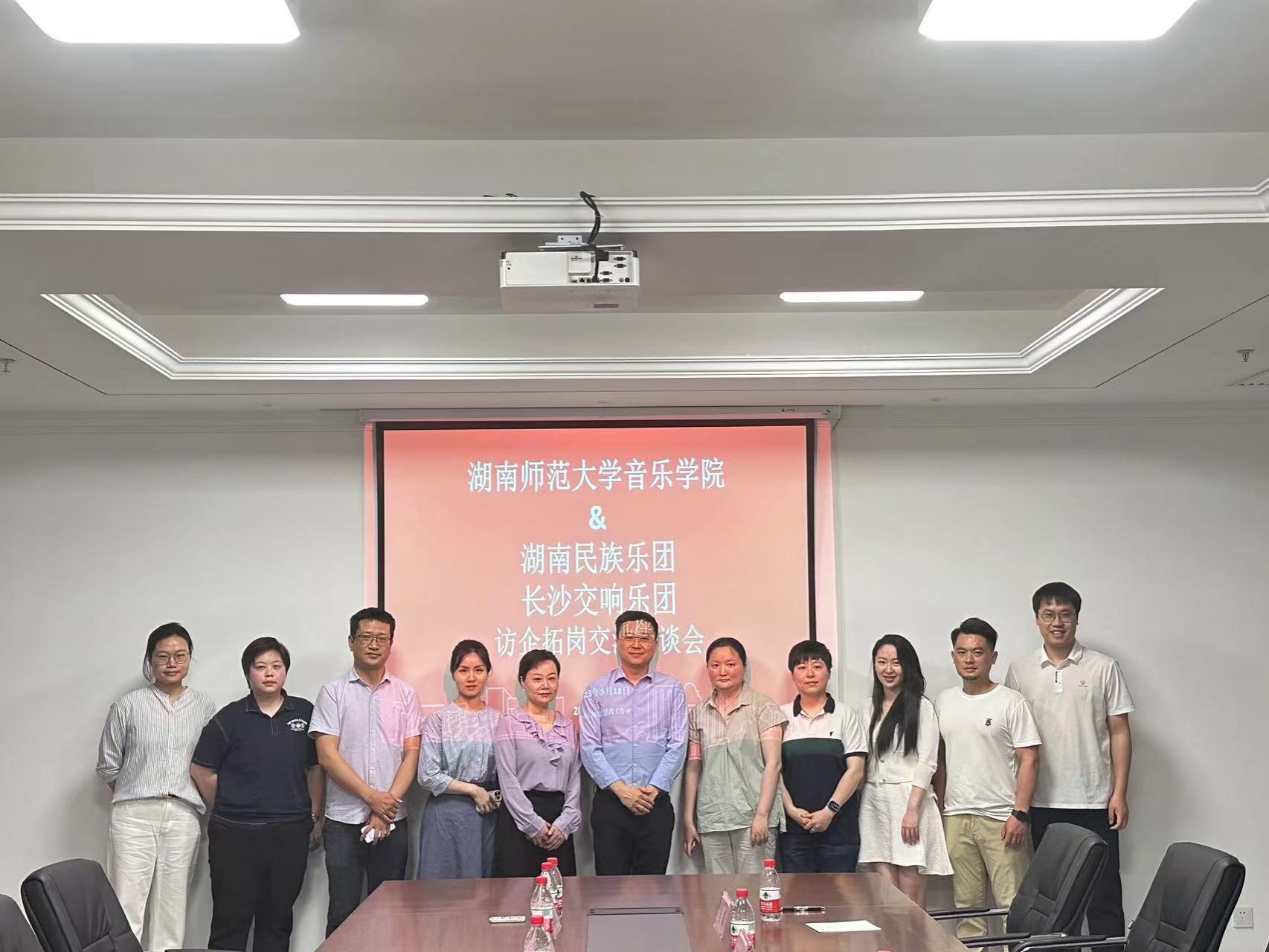 陈果一行人深入湖南省演艺集团有限责任公司工作现场一线,并深入了解了用人单位的工作环境、基础设施、文化氛围与工作机制,随后与该用人单位召开访企拓岗交流座谈会。湖南民族乐团团长曹鹏、副团长罗林茂、副团长崔甜甜、长沙交响乐团副总经理张薇薇、艺术中心主任罗莉、市场拓展部副主任李佳蔚以及陈果一行人参与座谈会议。