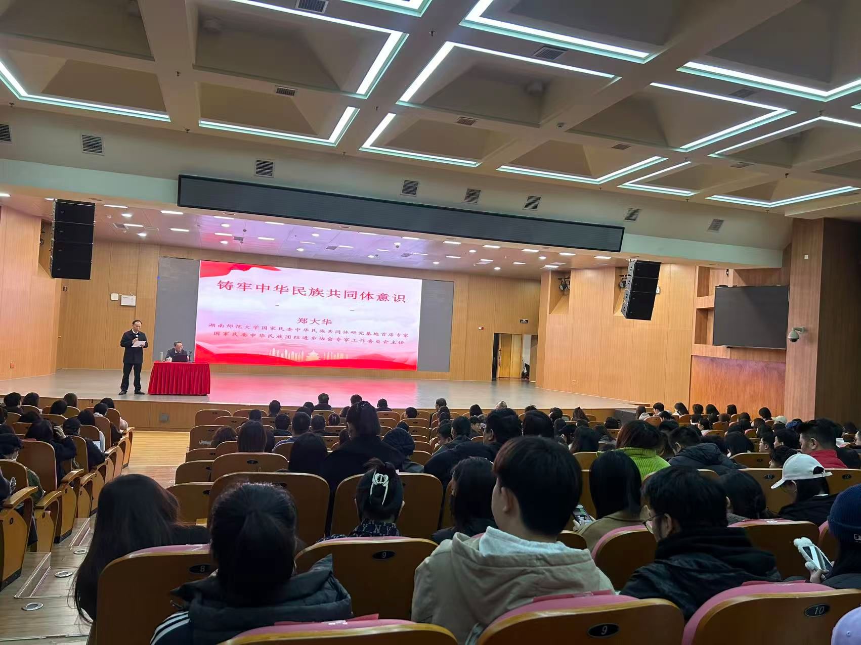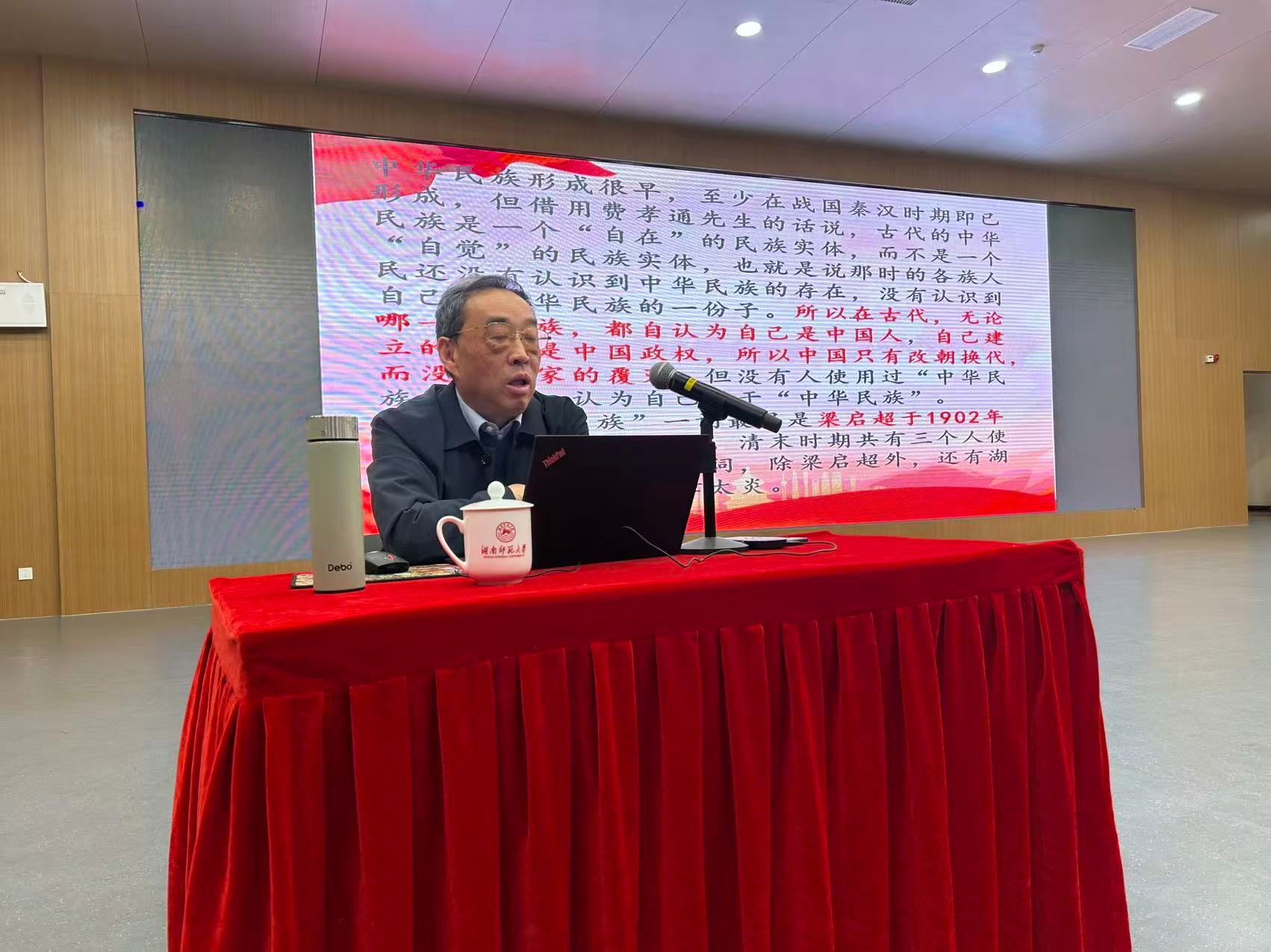 郑大华教授从铸牢中华民族共同体意识的提出、什么是中华民族共同体意识、为什么要铸牢中华民族共同体意识、怎么样铸牢中华民族共同体意识及铸牢中华民族共同体意识是党在新时代民族工作的理论创新五个方面作了深入全面阐述。郑老师指出,铸牢中华民族共同体意识是习近平新时代中国特色社会主义思想的重要组成部分,是新时代民族工作的纲领。各族人民要牢记休戚与共、荣辱与共、生死与共、命运与共的共同体理念。“四个与共”阐明了中华民族共同体的基本内涵,是新时代民族理论创新发展的具体体现。在全面建设社会主义现代化国家新征程上,我们必须以习近平新时代中国特色社会主义思想为指导,全面贯彻民族理论与政策,不断汇聚实现中华民族伟大复兴的磅礴力量。以党的建设为引领,以经济建设为基础,以制度建设为抓手,以文化建设为载体,“各民族要互相了解、互相尊重、互相包容、互相欣赏、互相学习、互相帮助,像石榴籽那样紧紧的抱在一起。”