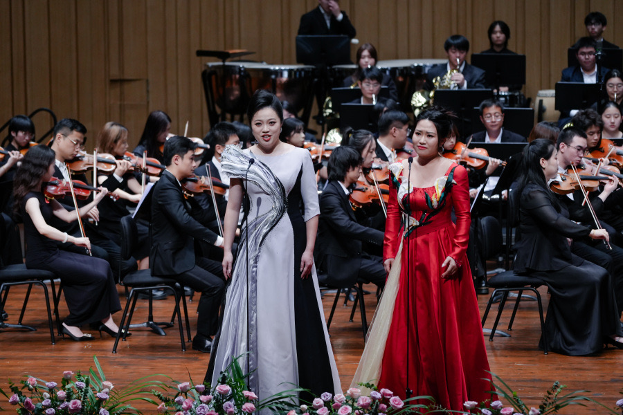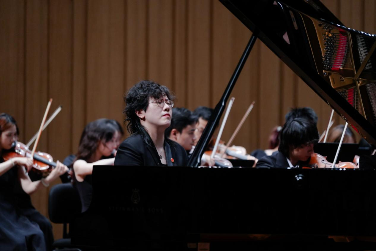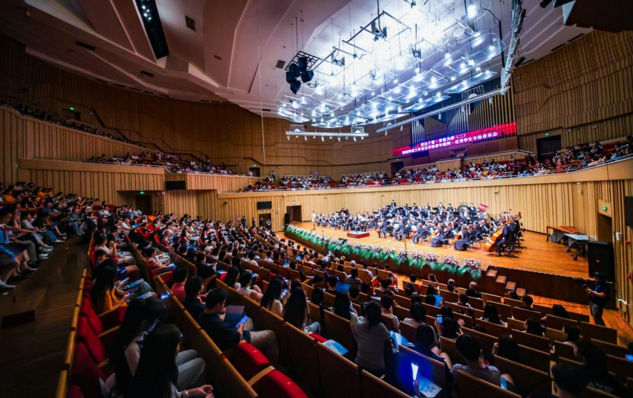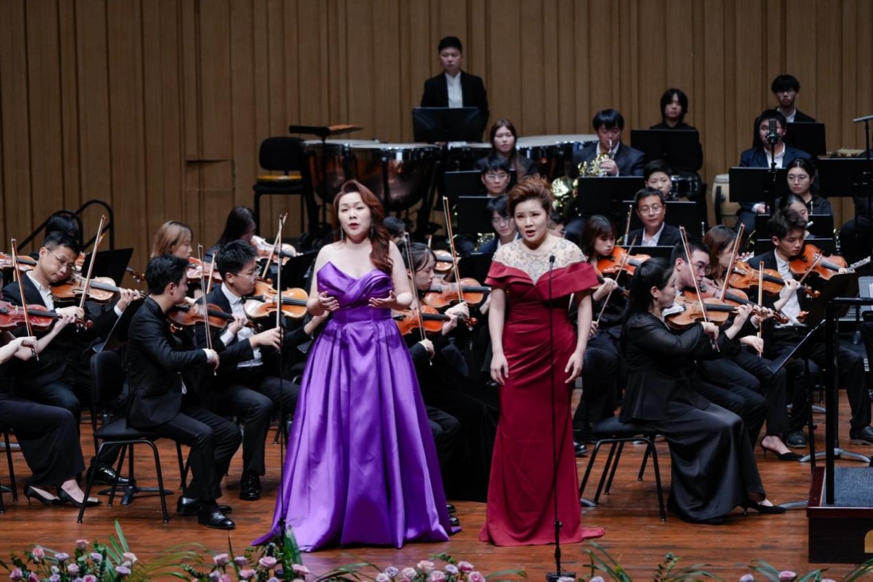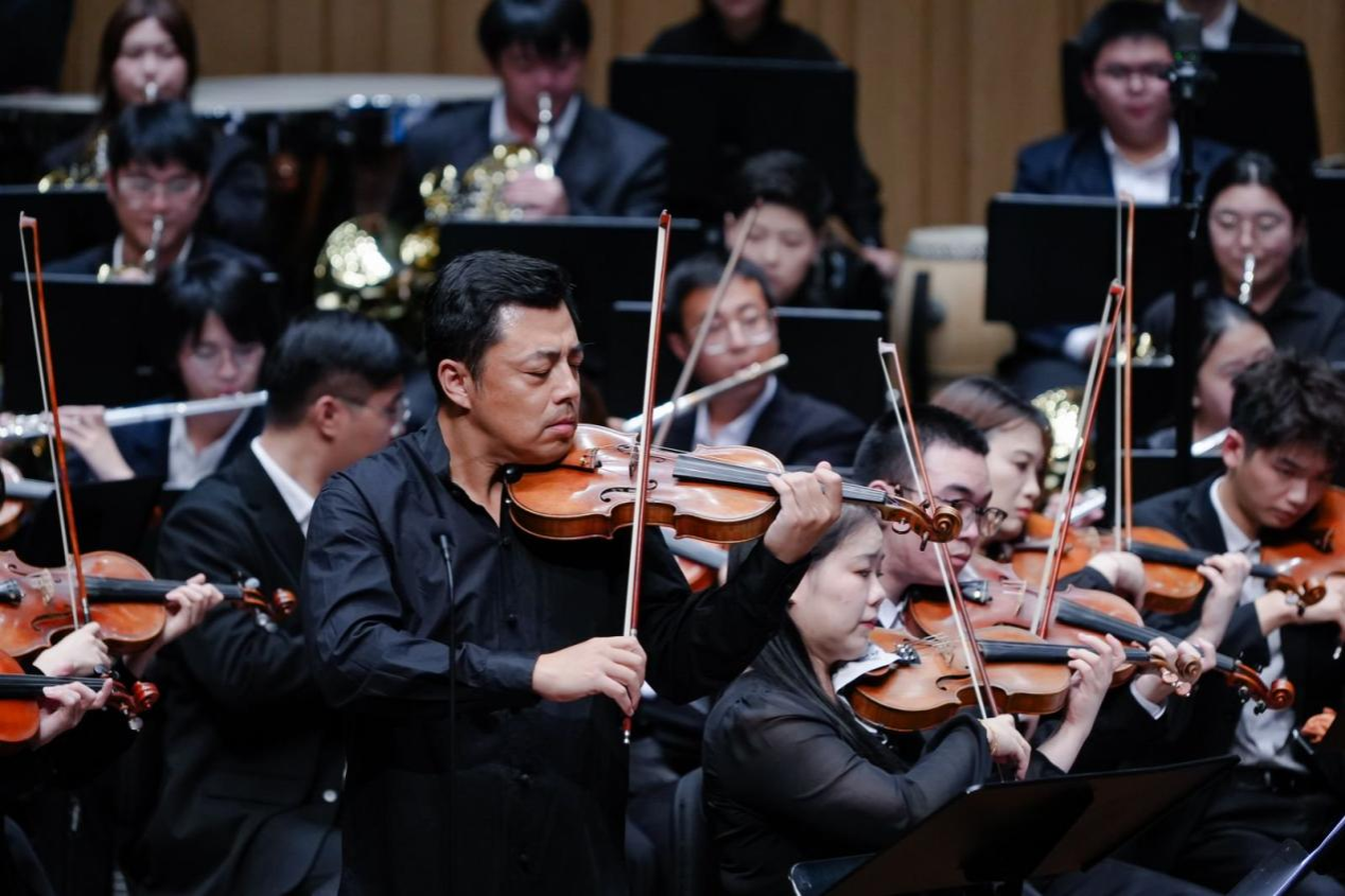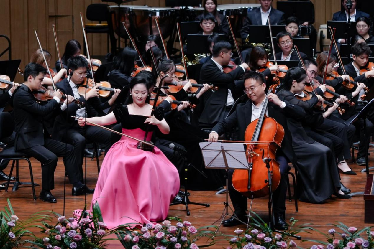 音乐会在潇湘爱乐交响乐团充满浓郁湖南味道的管弦乐《花鼓抒怀》中拉开帷幕。作品由beat365手机版官网入口经理廖勇教授创作,将湖南花鼓戏的灵魂旋律和独特元素融入交响语境,彰显了厚重的地域文化底蕴。随后,青年教师王艺璇、博士生曲丹分别演唱了《岳麓书院》《高山流水》,显示出金钟奖实力的完美唱功。青年教师王文洁、陈薪竹、彭帅理、陈浩然合作的器乐合奏《Tico Tico》节奏明快,嗨翻全场。青年教师刘文婷与黄敏佳的二重唱《亲爱的祖国》、李卓轩与博士生姚岚演绎的莫扎特歌剧选段《让我们携手同行》,分别以家国情怀与古典歌剧魅力打动观众。青年教师周末表演的钢琴协奏曲《保卫黄河》激昂慷慨,奏响民族精神强音,传达出音乐巨大的号召力量。