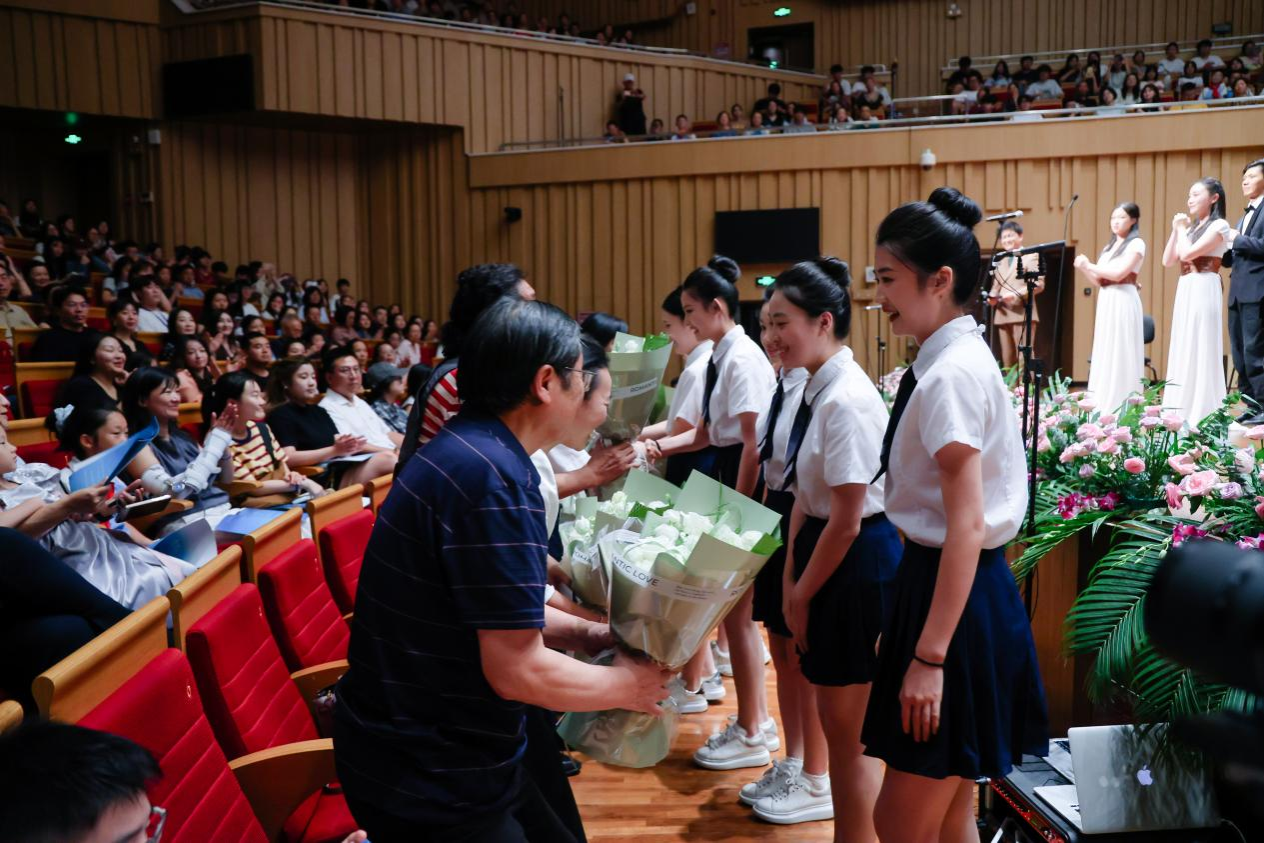 伴随着天籁合唱团《感恩的心》的轻声合唱,一场别致的致敬教师仪式温情上演。作为特邀嘉宾出席的教师代表一一亮相,他们包括湖南省优秀教师肖北庚、湖南省最美教师邓验、湖南省基础教育名师名董事长工作室负责人李晓玲、湖南师大退休教师徐书华和黄洋波和师德标兵李虹等。伴随着动人的歌声,青年学子向教师代表们献上鲜花,全场观众也齐声向老师们道一声“老师好”,热烈的掌声在音乐厅内久久回荡,向长期扎根三尺讲台、默默奉献的老师们致以最诚挚的祝福。