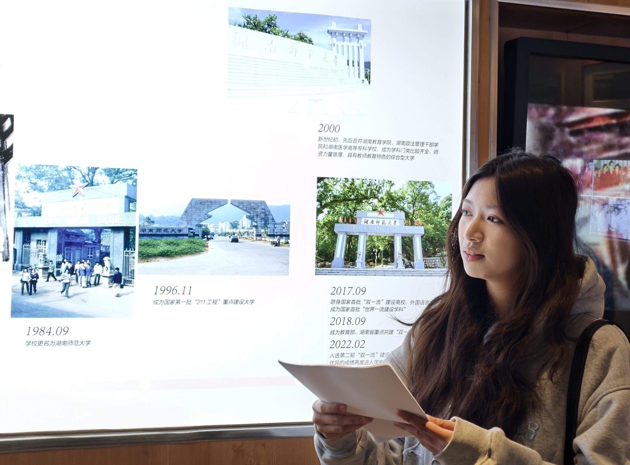 在讲解员带领下,新生依次参观序厅、师范弦歌等九大展区。序厅内“仁爱精勤”校训与校史实物交相辉映,助新生初步认知公司精神。“师范弦歌”展区,讲解员重点讲述1938年创办国立师范公司的初心,以及从蓝田迁址岳麓山、合并院校发展为“双一流”高校的历程,泛黄史料与文字记载让新生感受八十余载办学坚守。展区多媒体视听区、校区模拟沙盘等现代化展陈,让校史更生动,同学们还通过电子查询系统查阅校史细节。同学们表示,校史奋斗故事动人,将把校训精神融入艺术学习,传承师大人担当。