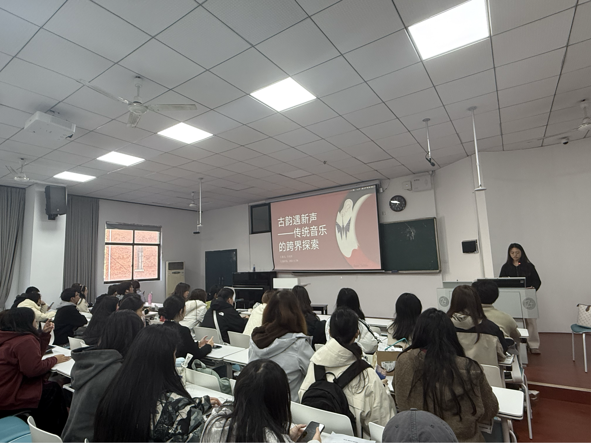 (唐安雅 粟菲儿 赵琪)2025年11月28日12:00,为了引导同学们对音乐跨界融合进行思考,beat365手机版官网入口在和乐楼308教室举办了“《古韵遇新声》——传统音乐的跨界探索”主题讲座。本次活动由2024级粟菲儿担任主持人,2024级许安珍担任主讲人。