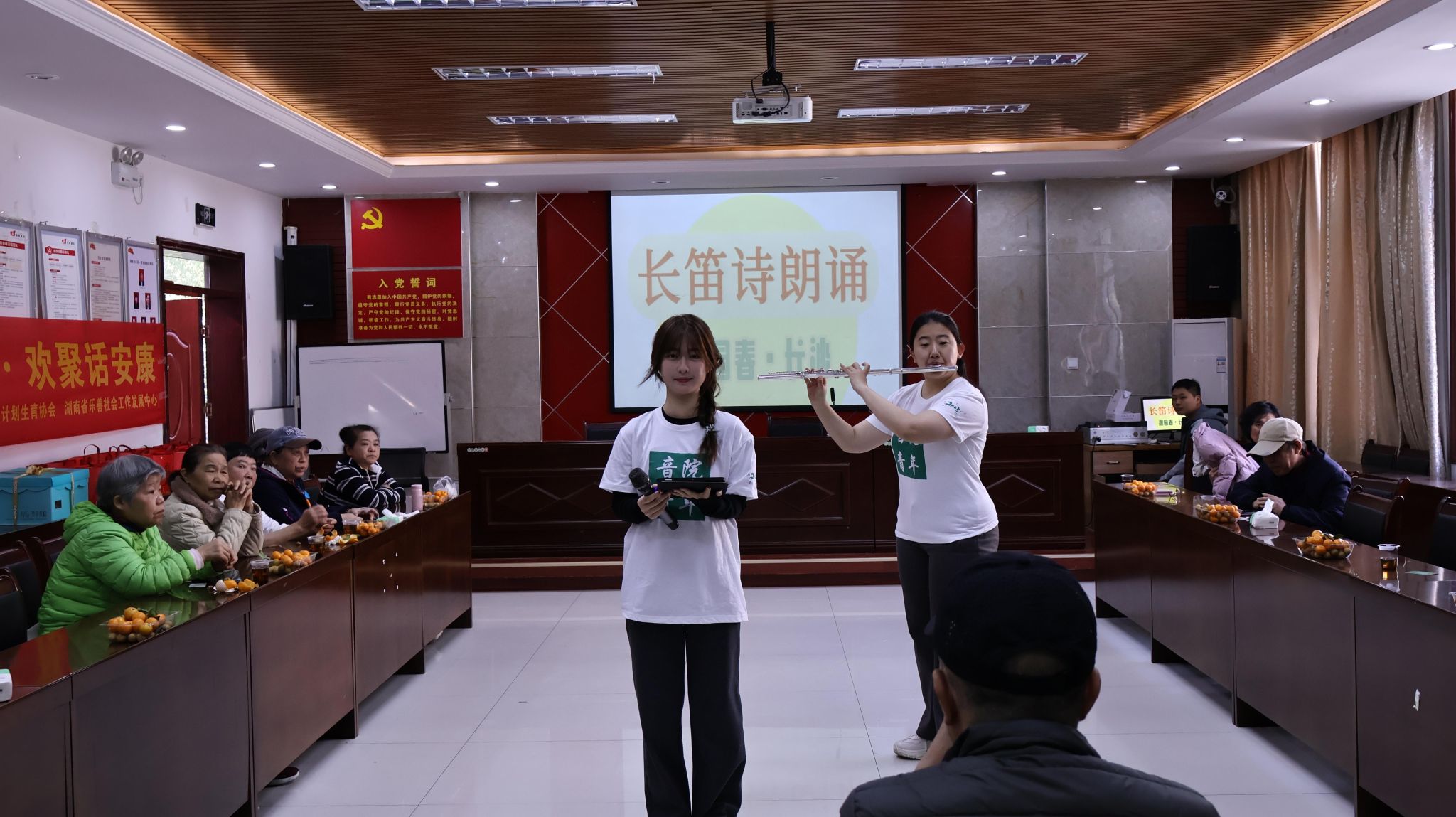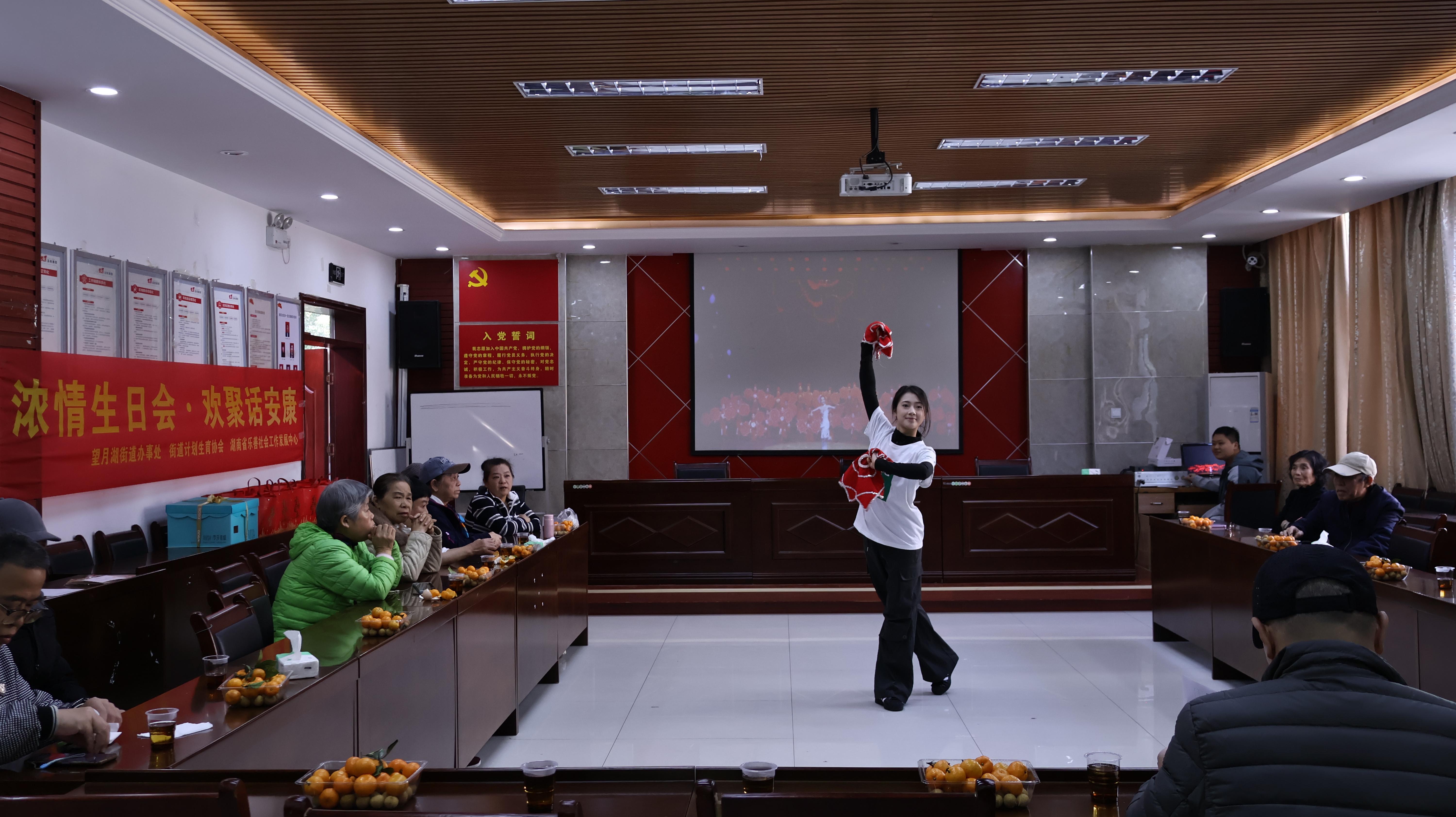 演出在充满东北风情的舞蹈《大姑娘美》中拉开序幕,志愿者们舞步灵动、笑容明媚,为现场增添了浓浓的喜庆与暖意;诗朗诵《沁园春·长沙》将古典诗词与长笛乐音巧妙融合,志愿者们以艺术之美向老人们表达着真挚的敬意;舞蹈《梨园一生》巧妙融合戏曲的圆场步伐与多样舞蹈技巧、国标舞《跃动节拍》以明快节拍和舒展肢体展现恰恰与伦巴的魅力,将现场气氛推向高潮。最后,全体志愿者与老人们共同唱响《生日快乐歌》,伴随着温暖的歌声,社区工作人员端上定制蛋糕,志愿者们亲切地陪在老人身旁,与他们一同分享喜悦、畅聊家常,现场气氛温馨感人。