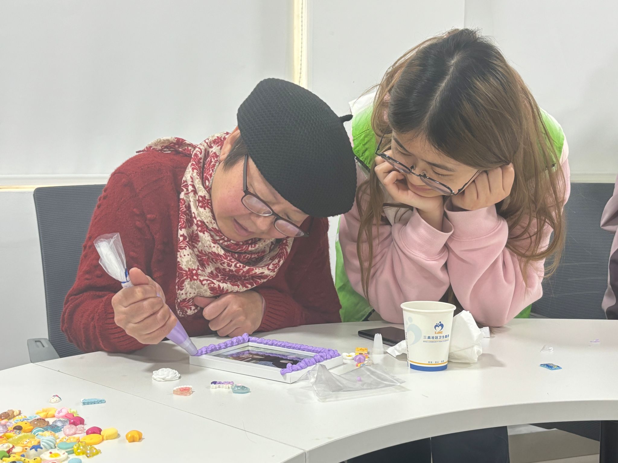 活动开始,志愿者为老人们介绍了相框装饰技艺的非遗背景与设计理念,并展示了奶油胶、国风贴片、树脂配件等多种制作材料。随后,老人们依据个人喜好,挑选了心仪的颜色与配件。在志愿者的逐步指导下,他们尝试涂抹奶油胶勾勒相框边框,并搭配各类贴片与配件进行创意粘贴。过程中,志愿者们始终在旁耐心的协助老人们调整胶量、矫正手法、整理粘贴位置,并一一解答制作中遇到的问题。当一个个色彩缤纷、充满巧思的奶油胶相框完成时,老人们互相展示作品,现场洋溢着温馨愉快的氛围。