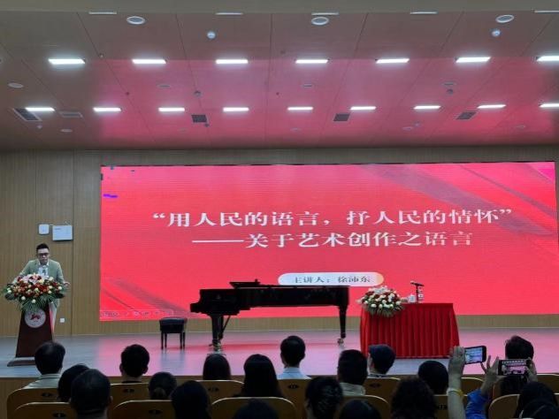 徐沛东老师以著名画家黄永玉先生的画展为导入,开始讲座,他分析了艺术语言如何受到大众欢迎,阐述了语言在艺术创作中的重要性,并结合自己丰富的创作经验,分享了如何运用人民的语言和情怀进行艺术创作。徐老师结合习近平总书记在文艺座谈会上的重要讲话精神,通过对他创作的《篱笆的影子》《亚洲雄风》《黄河渔娘》等作品的讲解与欣赏,分析了如何在音乐创作中运用独特的地方语言、时代语言、民族语言等来表达情感和刻画形象。