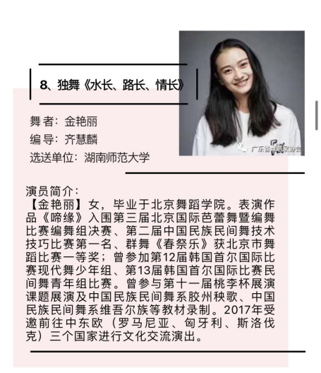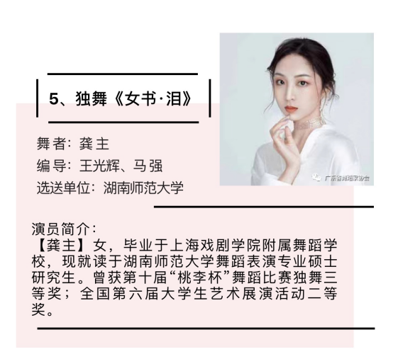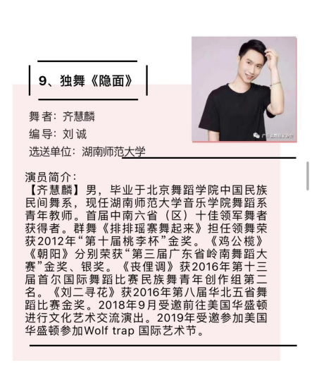 公司青年舞蹈教师齐慧麟荣获“十佳青年领军舞者”,并被授予“中南六省(区)青年舞蹈家”称号;青年舞蹈教师金艳丽、2020级舞蹈表演方向硕士研究生龚主双双荣获“十佳青年优秀舞者”称号。由王光辉、马强原创舞蹈《女书·泪》、齐慧麟原创舞蹈《水长、路长、情长》、刘诚原创舞蹈《隐面》三个作品全部荣获编导银奖。