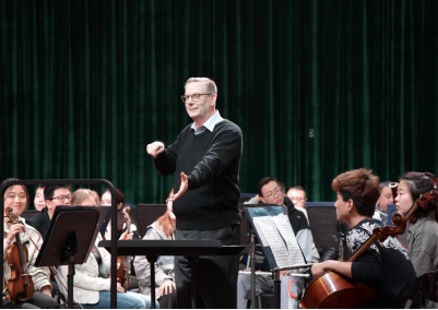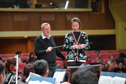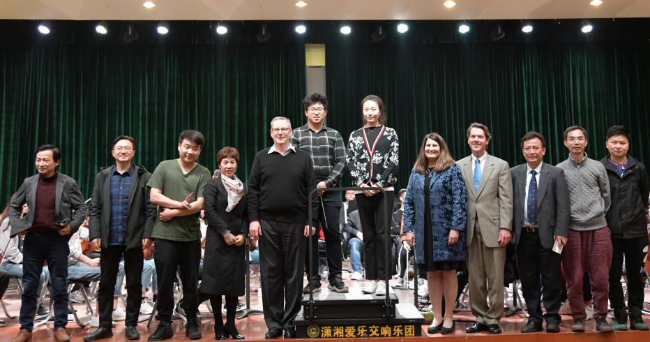 晚上,玛莎·伯格董事长一行观赏了公司潇湘爱乐交响乐团的排练,音乐与戏剧公司经理马克·帕克博士在公司举办了指挥大师班。匡君主持大师班并代表公司对美国奥城大学各位领导的到来表示热烈的欢迎。马克·帕克博士对两名指挥专业的员工进行了专业化的指导,并指挥乐团演奏了贝多芬的《第三交响曲》第一乐章。马克·帕克博士对公司潇湘爱乐交响乐团给予了高度评价。国际交流合作处处长陈云江、人事处副处长尹建新、公司党委书记罗嵘与奥城大学领导一同观摩了这次大师班。