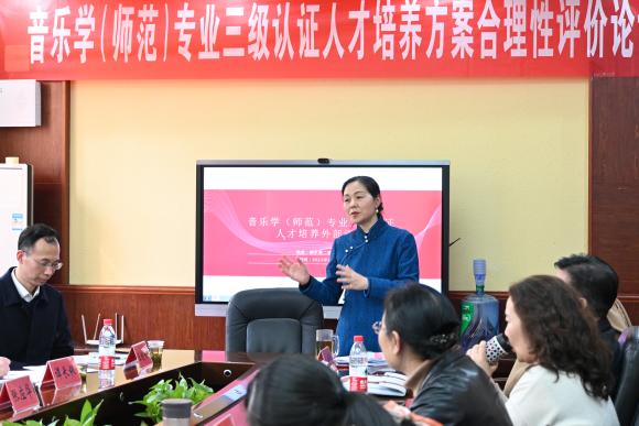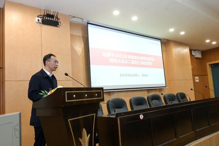 资利萍副经理作为专业负责人,以“着眼于2035年卓越音乐教师培养的师范认证从二级到三级的进阶”为题,从师范认证的背景、本专业的进阶情况、外部评价如何实施三个方面进行了主题汇报。