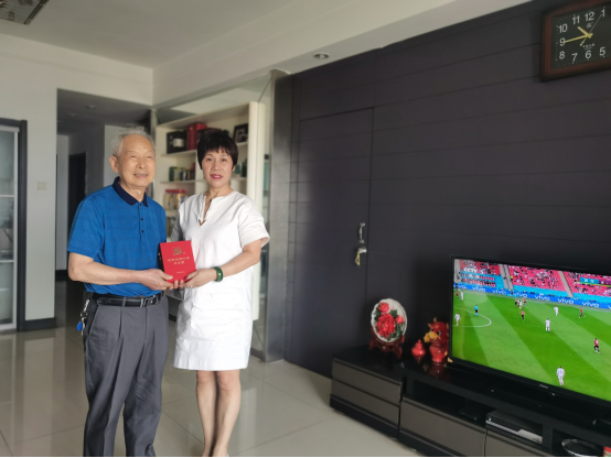 邓其熙、李巧兰两位老师居住在外地,因疫情,公司党委将纪念章邮寄给他们,并转达了党中央、公司党委对他们的慰问和关怀。两位老师非常高兴,表示能够受到党组织的关心,深感欣慰,并发来照片以表达对党的热爱和感激之情。